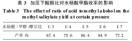 由表2可知,隨著醇量的增加,反應(yīng)溫度下降;相反,醇量下降,反應(yīng)溫度升高,收率增大。可見(jiàn),反應(yīng)溫度在一定范圍內(nèi)對(duì)收率的影響要大于醇量的影響,而常壓反應(yīng)溫度受制于甲醇的沸點(diǎn)。因此,本實(shí)驗(yàn)通過(guò)加壓的方法提高反應(yīng)溫度。并在加壓的反應(yīng)條件下:水楊酸20.7g,對(duì)甲苯磺酸0.5g,反應(yīng)時(shí)間6h,反應(yīng)壓力140kPa,考察了醇酸比對(duì)收率的影響,結(jié)果見(jiàn)表3。