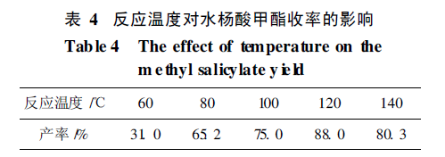 在確定了催化劑、醇酸比的基礎(chǔ)上對(duì)溫度的影響進(jìn)行考察,反應(yīng)條件:水楊酸20.7g,甲醇36mL,對(duì)甲苯磺酸0.5g,加壓反應(yīng)6h,結(jié)果見(jiàn)表4。