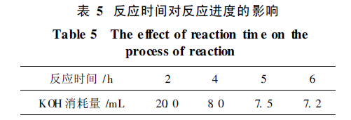 由表5可知,當(dāng)反應(yīng)進(jìn)行到5h后,所消耗KOH的量變化不大,說(shuō)明反應(yīng)5h已接近反應(yīng)平衡點(diǎn),再繼續(xù)延長(zhǎng)反應(yīng)時(shí)間對(duì)轉(zhuǎn)化率影響不大。因此,反應(yīng)時(shí)間以5h為宜。