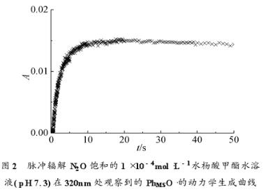 在320nm和380nm觀察到兩個(gè)寬而強(qiáng)的吸收峰。320nm、380nm吸收峰被歸屬為水楊酸甲酯酚氧自由基(PhMSO·),這是羥基自由基進(jìn)攻水楊酸甲酯分子結(jié)構(gòu)中酚羥基,抽氫所形成。320nm、380nm瞬態(tài)粒子的產(chǎn)生主要來(lái)自以下過(guò)程:MS+·OH PhMSO·+H2O脈沖輻解N2O飽和的1×10-4mol·L-1水楊酸甲酯水溶液(pH7.3),所產(chǎn)生的PhMSO·在320nm、380nm處觀察到的動(dòng)力學(xué)生成曲線如圖2所示。