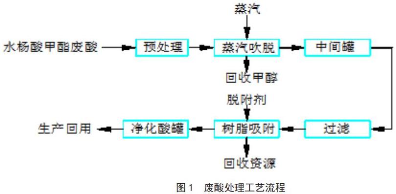 水楊酸甲酯廢酸目前處理方法主要有物理吸附法、化學(xué)氧化法、及絡(luò)合萃取法等。 樹脂吸附法雖然投資成本稍高,但工藝操作簡便,且能從廢酸中回收大部分水楊酸、5-磺基水楊酸等有用資源。 化學(xué)氧化一般采用臭氧氧化與活性炭吸附合用工藝,但由于臭氧的損失和耗電量的增加,成本進(jìn)一步加大。如果減小臭氧濃度,則處理效果變差,并且活性炭僅僅是將水楊酸和磺基水楊酸富集起來,往往會(huì)造成二次污染。 絡(luò)合萃取法能耗高、萃取劑流失、出水水質(zhì)差,需與其它方法配合使用。 根據(jù)廢酸水質(zhì)特征及處理要求,廢水處理工藝主要采用“預(yù)處理+蒸汽吹脫+樹脂吸附”組合處理工藝。飛速處理工藝流程見下圖:
