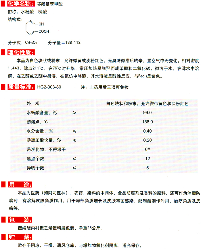 本品為白色塊狀和粉末,允許微黃或淺粉紅色,無臭味微甜后轉辛,置空氣中無變化,76°C以下能常壓升華,常壓加熱易脫羧而成苯酚及二氧化碳,其中水溶液呈酸性反映,與FeCI3呈紫色,本品在水中微溶、在沸水中溶解,在乙醇或乙醚中易溶,在氯仿中略溶。