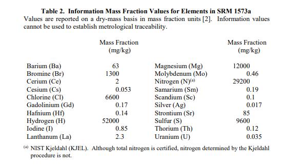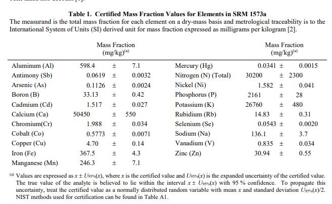 NIST SRM 1573a 番茄葉(標(biāo)準(zhǔn)品)主要用于驗(yàn)證測(cè)定植物材料、農(nóng)產(chǎn)品和類(lèi)似材料中主要、次要和微量元素的分析方法。在為內(nèi)部控制材料分配值時(shí),此 SRM 可用于質(zhì)量保證。一個(gè) SRM 1573a 單元由 50 克干番茄葉組成。認(rèn)證的質(zhì)量分?jǐn)?shù)值:認(rèn)證的質(zhì)量分?jǐn)?shù)值在表 1 中提供。 NIST 認(rèn)證值是 NIST 對(duì)其準(zhǔn)確性有最高置信度的值,因?yàn)樗幸阎蚩梢傻钠顏?lái)源都已被考慮在內(nèi)