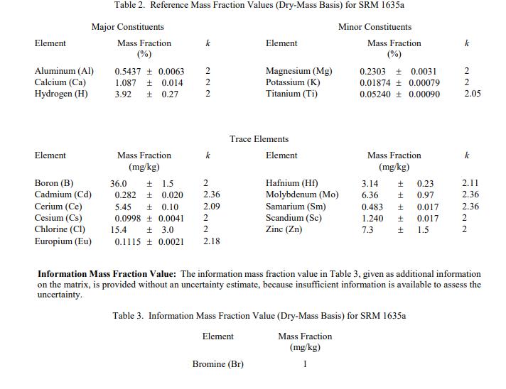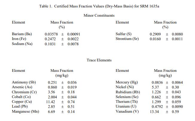 表 1 中提供了 19 種元素的認(rèn)證質(zhì)量分?jǐn)?shù) [1] 值,以干質(zhì)量表示。NIST 認(rèn)證值是 NIST 對(duì)其準(zhǔn)確性有最高置信度的值所有已知或可疑的偏見來源都已被調(diào)查或考慮 [2]。認(rèn)證值是對(duì)真實(shí)值的當(dāng)前最佳估計(jì)。