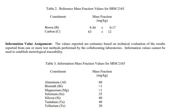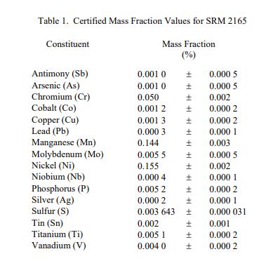 SRM 2165 的 16 種成分的認證值在表 1 中報告為質(zhì)量分數(shù) [1]。 NIST 認證值是 NIST 對其準確性具有最高置信度的值,因為所有已知或可疑的偏差來源都已被調(diào)查或考慮在內(nèi) [2]。認證值是存在的根據(jù) NIST 和合作實驗室使用表 4 中所示的測試方法進行的分析結(jié)果對真實值的最佳估計。