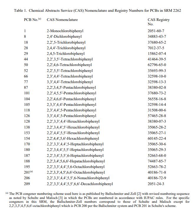 NIST SRM 2262 2,2,4-三甲基戊烷PCB同系物(標(biāo)準(zhǔn)品)是 28 種氯化聯(lián)苯同系物(也稱為多氯聯(lián)苯 (PCB) 同系物)在 2,2,4-三甲基戊烷(異辛烷)中的溶液。表 1 中列出了每種成分的化學(xué)文摘社 (CAS) 命名法和登記號。此 SRM 主要用于校準(zhǔn)色譜儀器,用于確定經(jīng)認(rèn)證的化合物。一個 SRM 2262 單元由五個 2 mL 安瓿組成,每個安瓿含有大約 1.2 mL 溶液。