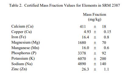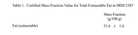 表 1 至表 3 中提供了 SRM 2387 中脂肪、元素和生育酚的認證質(zhì)量分數(shù)值。NIST 認證值是 NIST 對其準確性有最高置信度的值,因為所有已知或懷疑偏差的來源已被考慮 [1]。價值分析分配由 NIST 和合作實驗室完成。該材料中的認證質(zhì)量分數(shù)值計算為 NIST 方法的平均值和合作實驗室進行的測量的平均值(如果適用)。相關(guān)的不確定性以大約 95% 的置信水平表示 [2-4]。數(shù)值以質(zhì)量分數(shù)單位 [5] 以原樣(非干質(zhì)量)為基礎(chǔ)報告。