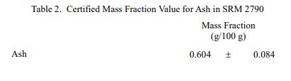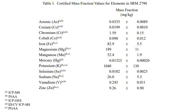 SRM 2790 中元素的認(rèn)證質(zhì)量分?jǐn)?shù)值,以干質(zhì)量為基礎(chǔ)報告,灰分分別在表 1 和表 2 中提供。 NIST 認(rèn)證值是 NIST 對其準(zhǔn)確性具有最高置信度的值,因為所有已知或可疑的偏差來源都已被調(diào)查或考慮在內(nèi) [1]。 NIST 進(jìn)行了賦值分析。認(rèn)證的質(zhì)量分?jǐn)?shù)值計算為 NIST 方法的平均值的平均值。相關(guān)的不確定性以大約 95% 的置信水平表示 [2-4]。