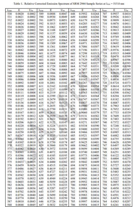 NIST SRM2944 熒光光譜的相對(duì)強(qiáng)度校正(標(biāo)準(zhǔn)品)旨在用于評(píng)估和校準(zhǔn)具有連續(xù)激發(fā)源的穩(wěn)態(tài)熒光光譜儀的相對(duì)光譜響應(yīng)度,并用于確定日常或儀器到儀器的強(qiáng)度變化單個(gè)或類(lèi)似的熒光儀器, SRM 2944 的一個(gè)單元由一塊比色杯形的實(shí)心玻璃組成。樣品系列裝置的序列號(hào)介于 Bi0XX 和 Bi0YY 之間。該 SRM 已通過(guò)相對(duì)校正發(fā)射光譜 E 的認(rèn)證,以相對(duì)能量單位表示,發(fā)射波長(zhǎng) λEM = 530 nm 至 830 nm,波長(zhǎng)間隔為 1 nm,固定激發(fā)波長(zhǎng) (λEX) 為 515.0 nm。由于峰值附近較大的信噪比水平,發(fā)射