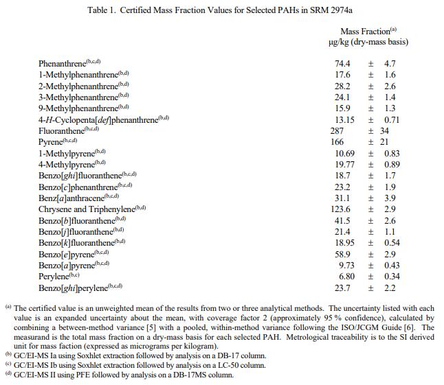表 1 至表 1 提供了以質(zhì)量分?jǐn)?shù)表示的 22 種 PAH(一些組合)、29 種 PCB 同族物(一些組合)、八種氯化農(nóng)藥和六種 PBDE 同族物(一些組合)的認(rèn)證值4、分別。甲基汞、無(wú)機(jī)汞和總汞的認(rèn)證值在表 5 中提供。NIST 認(rèn)證值是 NIST 對(duì)其準(zhǔn)確性有最高置信度的值,因?yàn)樗幸阎蚩梢傻钠顏?lái)源都已調(diào)查或考慮在內(nèi)[1]。認(rèn)證值基于 NIST 使用多種分析技術(shù)獲得的結(jié)果的一致性。